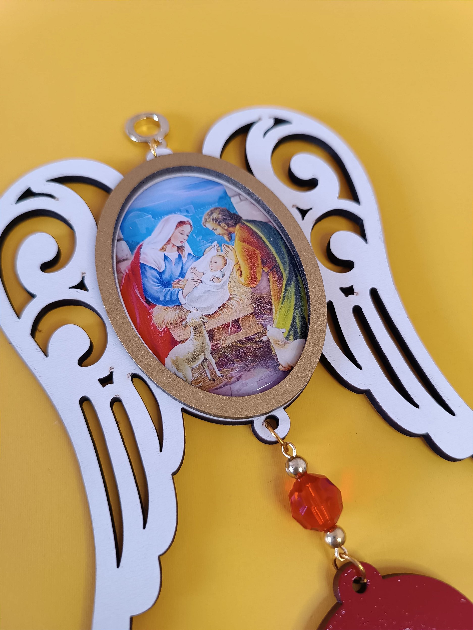 Celebre o espírito natalino com este delicado adorno de porta em MDF, perfeito para trazer beleza e fé à decoração da sua casa.
