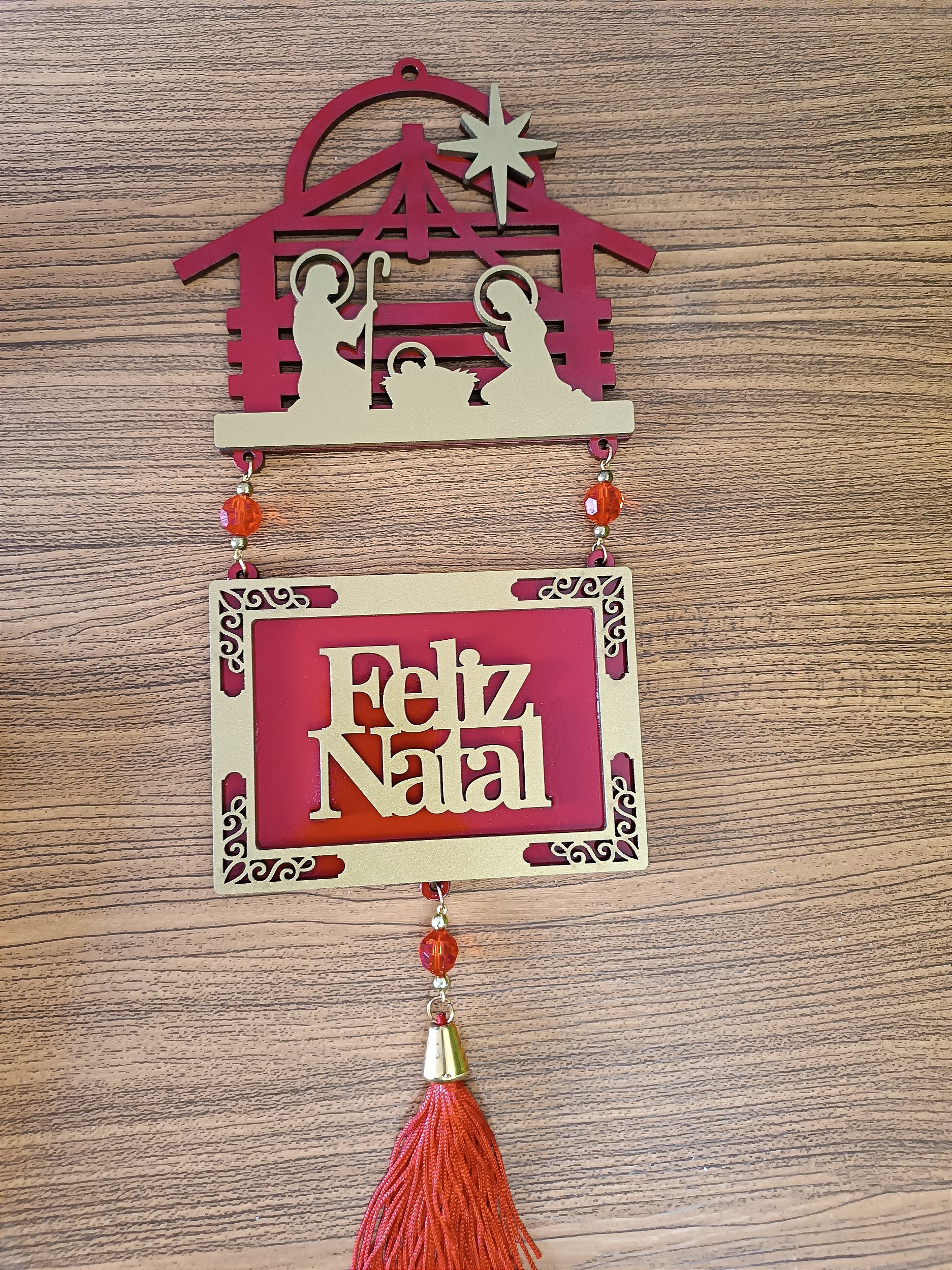 Celebre o espírito natalino com este delicado adorno de porta em MDF, perfeito para trazer beleza e fé à decoração da sua casa.
