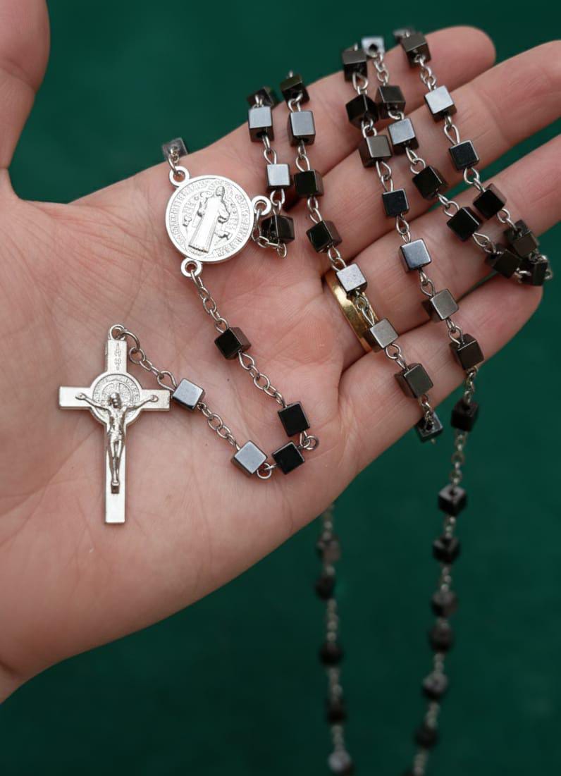 Seu grande diferencial está nas contas quadradas, que trazem um design moderno e marcante, tornando esta peça única e especial. A medalha de São Bento, símbolo tradicional de proteção contra todo mal, reforça a espiritualidade e a confiança na presença de Deus em todos os momentos.